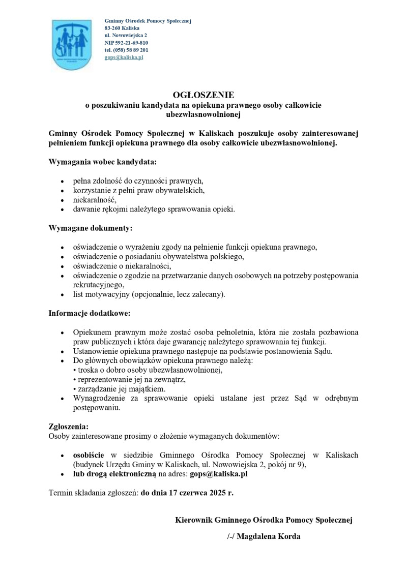 Ogłoszenie o poszukiwaniu kandydata na opiekuna prawnego