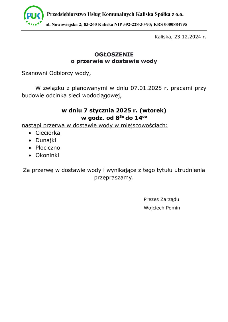 Budowa sieci kanalizacji sanitarnej, rozbudowa i przebudowa sieci wodociągowej dla miejscowości Cieciorka, Dąbrowa, Iwiczno wraz z rozbudową oczyszczalni ścieków w Kaliskach