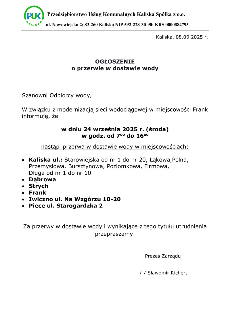Budowa sieci kanalizacji sanitarnej, rozbudowa i przebudowa sieci wodociągowej dla miejscowości Cieciorka, Dąbrowa, Iwiczno wraz z rozbudową oczyszczalni ścieków w Kaliskach