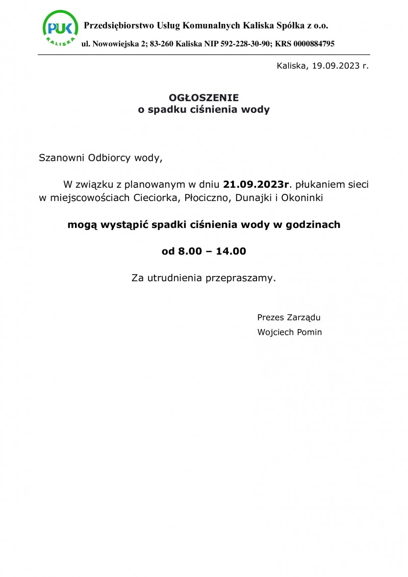 Budowa sieci kanalizacji sanitarnej, rozbudowa i przebudowa sieci wodociągowej dla miejscowości Cieciorka, Dąbrowa, Iwiczno wraz z rozbudową oczyszczalni ścieków w Kaliskach