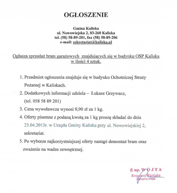 Ogłoszenie w sprawie sprzedaży bram garażowych znajdujących się w budynku OSP Kaliska