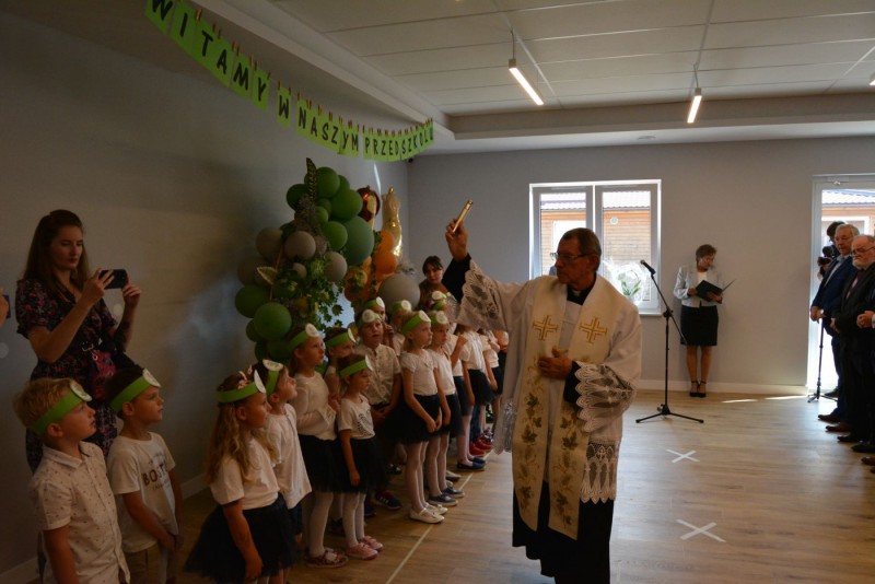 Po uroczystym przecięciu wstęgi nastąpiło poświęcenie budynku przez księdza Józefa Słupskiego. Po czym wstąpiły dzieci z Samorządowego Publicznego Przedszkola w Kaliskach, gdzie zaprezentowały swoje umiejętności wokalne oraz taneczne.