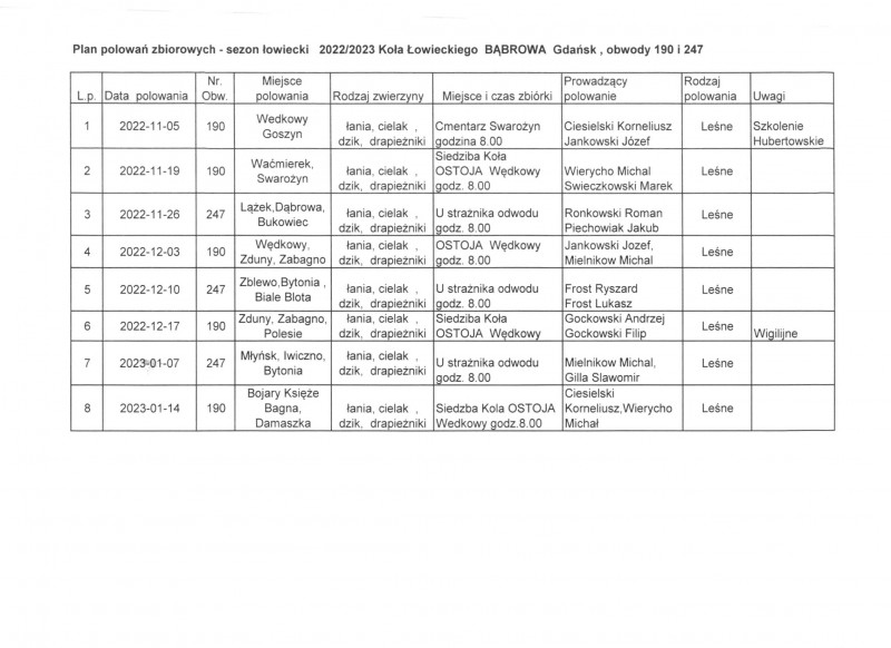 Plan polowań zbiorowych Koła Łowieckiego „Dąbrowa”