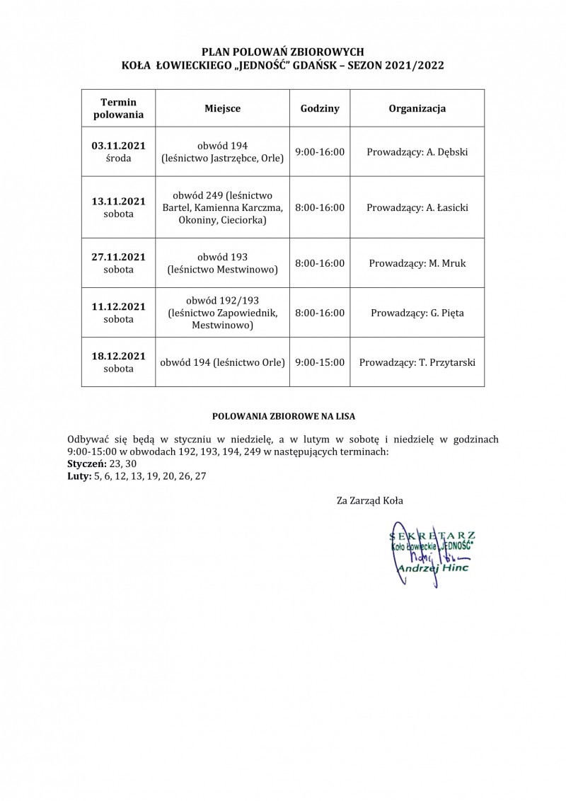 Plan polowań zbiorowych koła łowieckiego ,,Jedność''
