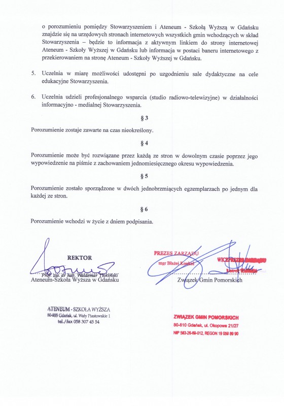 Wójt Gminy Kaliska informuje o zawartym porozumieniu przez Związek Gmin Pomorskich, którego członkiem jest Gmina Kaliska, z Ateneum – Szkołą Wyższą w Gdańsku. Porozumienie dotyczy możliwości ubiegania się przez rozpoczynających studia mieszkańców Gminy Kaliska o 5% bonifikatę w opłacie za czesne przez cały okres studiów na tej uczelni.