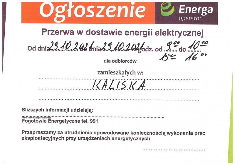 Przerwa w dostawie prądu w miejscowości Kaliska