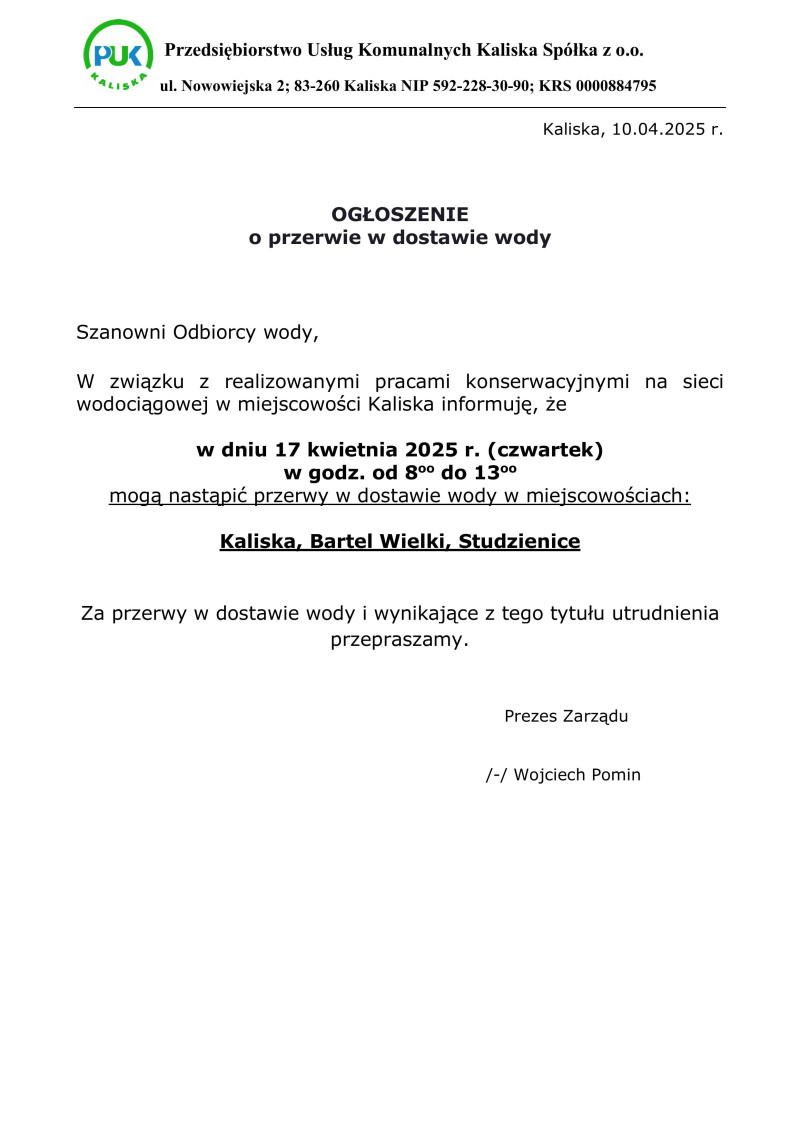 Przerwa w dostawie wody w miejscowości Kaliska, Bartel Wielki, Studzienice