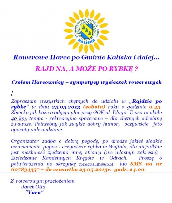 Stowarzyszenie Rozwoju Gminy Kaliska zaprasza na kolejny rajd rowerowy - tym razem "Po rybkę"