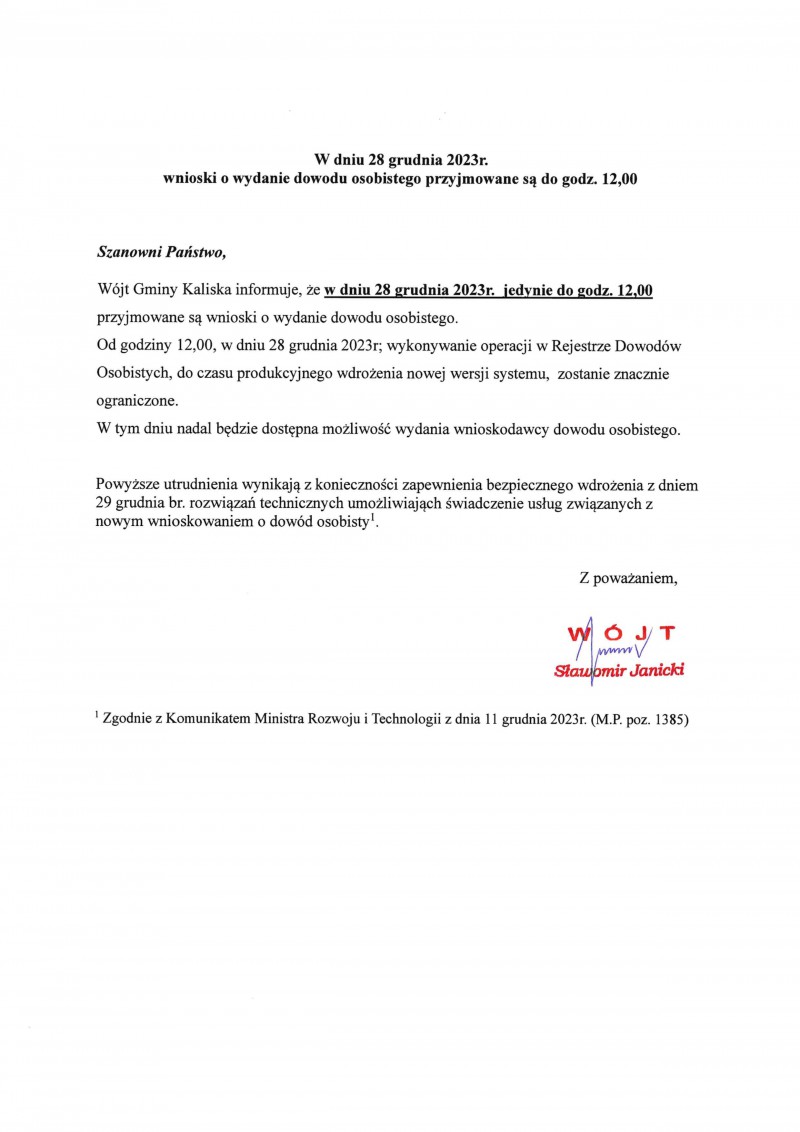 Wnioski o wydanie dowodu osobistego przyjmowane są w dniu 28.12.2023r. do godz. 12:00
