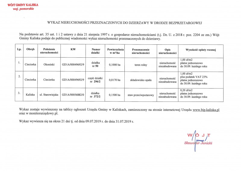 Wójt Gminy Kaliska ogłasza przetargi na zbycie nieruchomości gruntowych