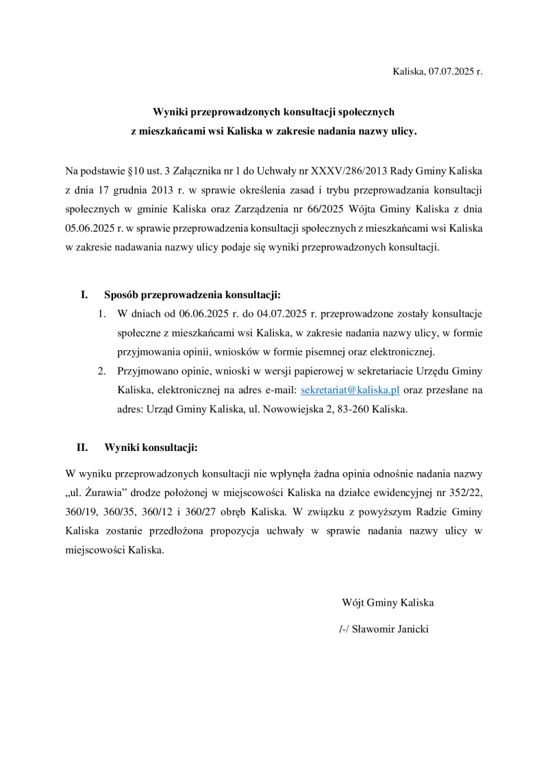 Wyniki przeprowadzonych konsultacji społecznych z mieszkańcami wsi Kaliska