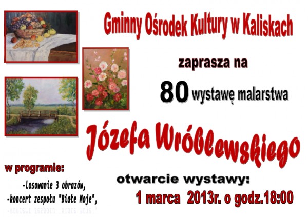 Józef Wróblewski -urodzony 11 września 1933 r. w Raciążu. Pasję do malowania wyniósł z domu rodzinnego, dziedzicząc ją po ojcu Franciszku, który był malarzem pokojowym, a w wolnych chwilach oddawał się malowaniu obrazów. Józef Wróblewski to jeden z najbardziej znanych plastyków w naszym regionie, znakomicie czuje się w akwareli jak i w oleju. Maluje plamą, tworząc barwną paletę nieprecyzyjną i dosłowną, a subtelną i niedookreśloną. W jego obrazach dominują motywy związane z przyrodą i kulturą Borów Tucholskich i Kaszub. Uczestniczy w licznych plenerach malarskich w kraju i za granicą doskonaląc swój warsztat twórczy. Od 1991r., jako członek Borowiackiego Towarzystwa Kultury w Tucholi współpracuje ze środowiskiem plastyków niemieckich z Olching. Prace Wróblewskiego znajdują się w zbiorach Muzeum Historyczno - Etnograficznego w Chojnicach, w zbiorach miast Tucholi i Olching oraz u licznych osób prywatnych w kraju i za granicą. Trzy wystawy Józefa Wróblewskiego można było oglądać w Gminnym Ośrodku Kultury w Kalisakch w roku 1990, 1995 oraz w 1998 . W Gminnym Ośrodku Kultury w Kaliskach prezentowanych jest 38 obrazów olejnych, w tym głownie pejzaże. Jest to 80 wystawa indywidualna artysty.
