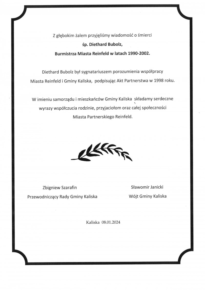 Z głębokiem żalem przyjeliśmy wiadomość o śmierci śp. Diethard Bubolz