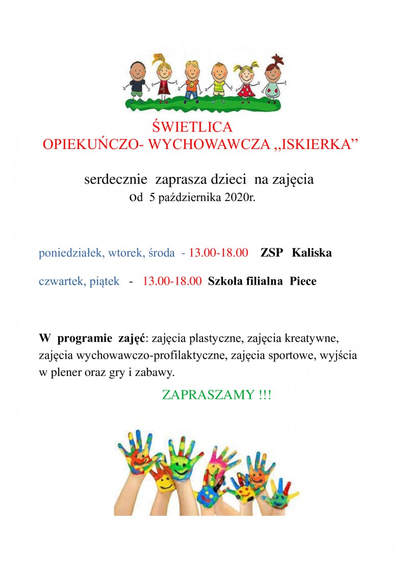 Zaproszenie na zajęcia do świetlicy ,,Iskierka''