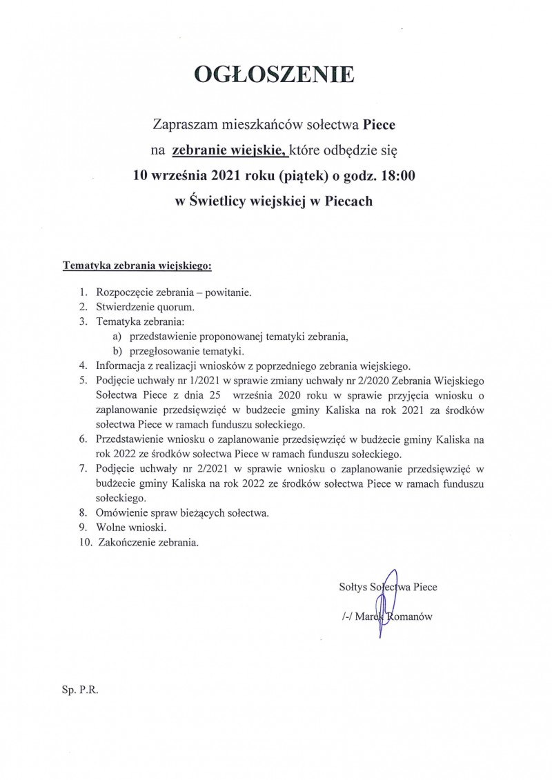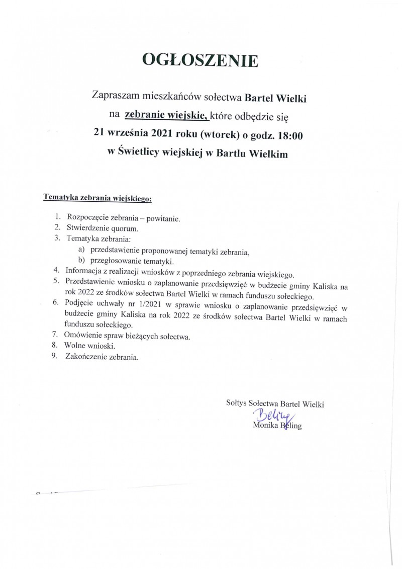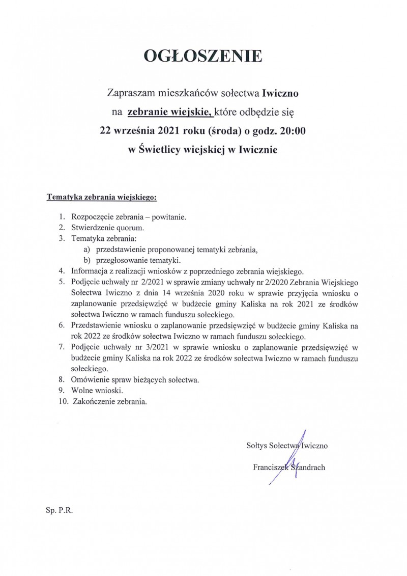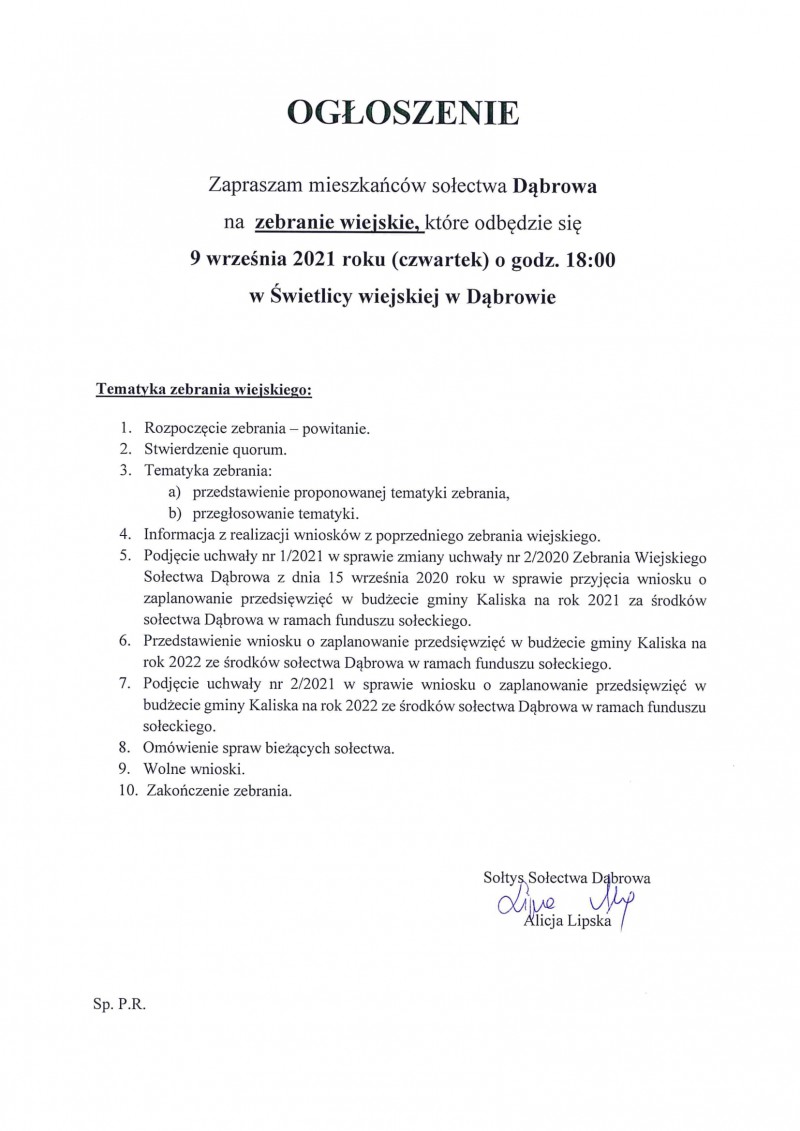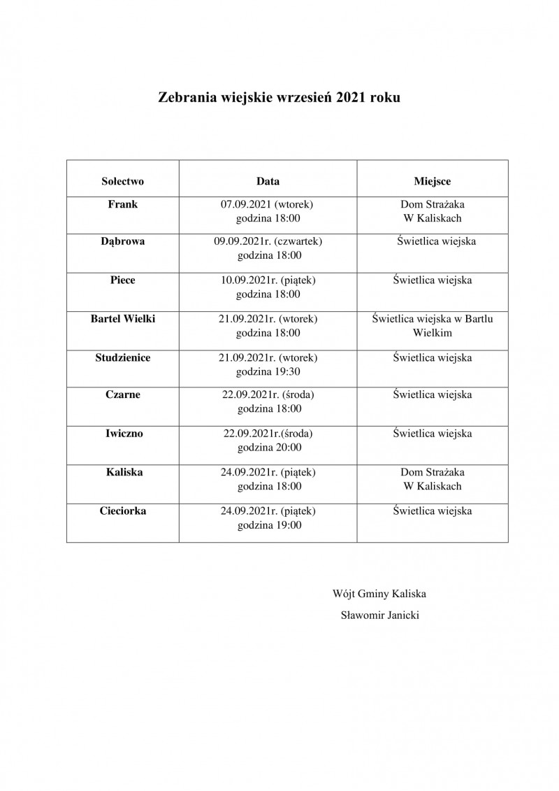 Wójt Gminy Kaliska oraz Sołtysi poszczególnych sołectw zapraszają mieszkańców gminy na zebrania wiejskie, których tematyka głownie skierowana będzie na zmiany funduszu sołeckiego na rok 2021 oraz zaplanowanie przedsięwzięć w budżecie gminy Kaliska na rok 2022 ze środków sołectw w ramach funduszu sołeckiego.
