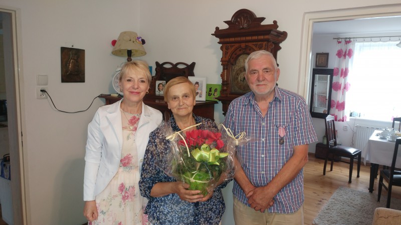 Z okazji „Złotych Godów” z najserdeczniejszymi życzeniami oraz medalami od Prezydenta RP, za długoletnie pożycie małżeńskie, odwiedzili Jubilatów: Wójt Gminy Kaliska - Sławomir Janicki i Kierownik USC Kaliska - Beata Wysokińska.