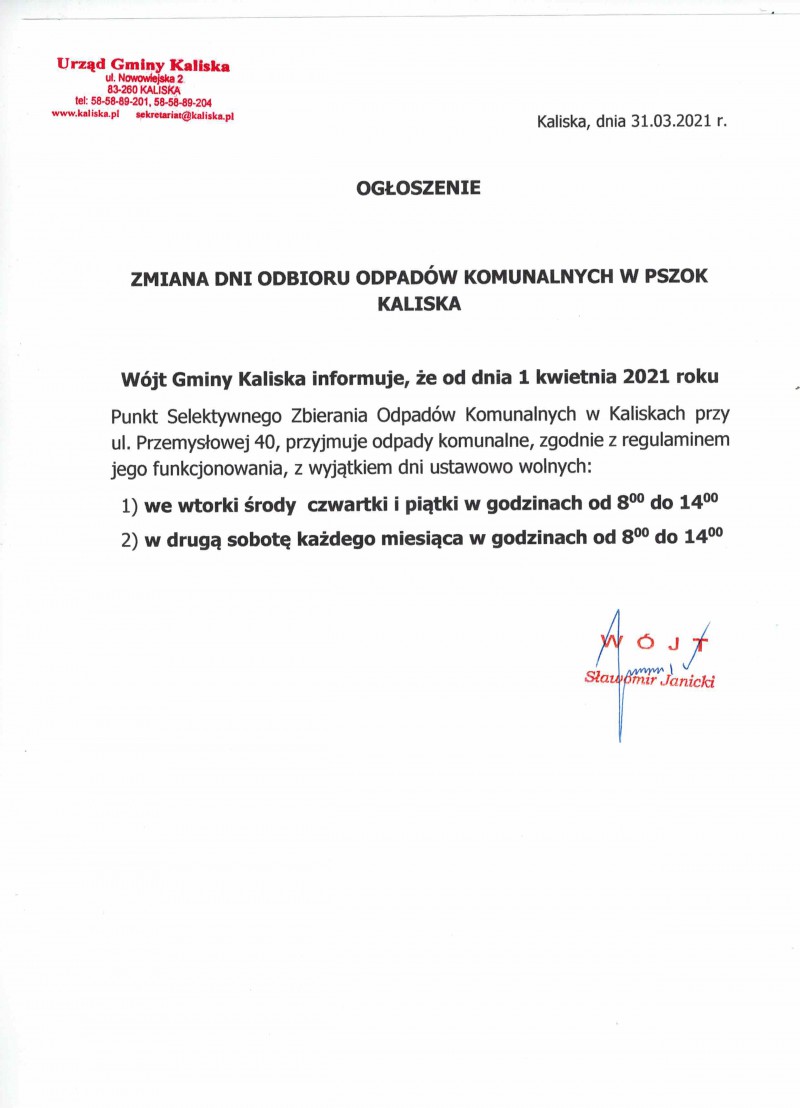 Zmiana dni odbioru odpadów komunalnych w PSZOK